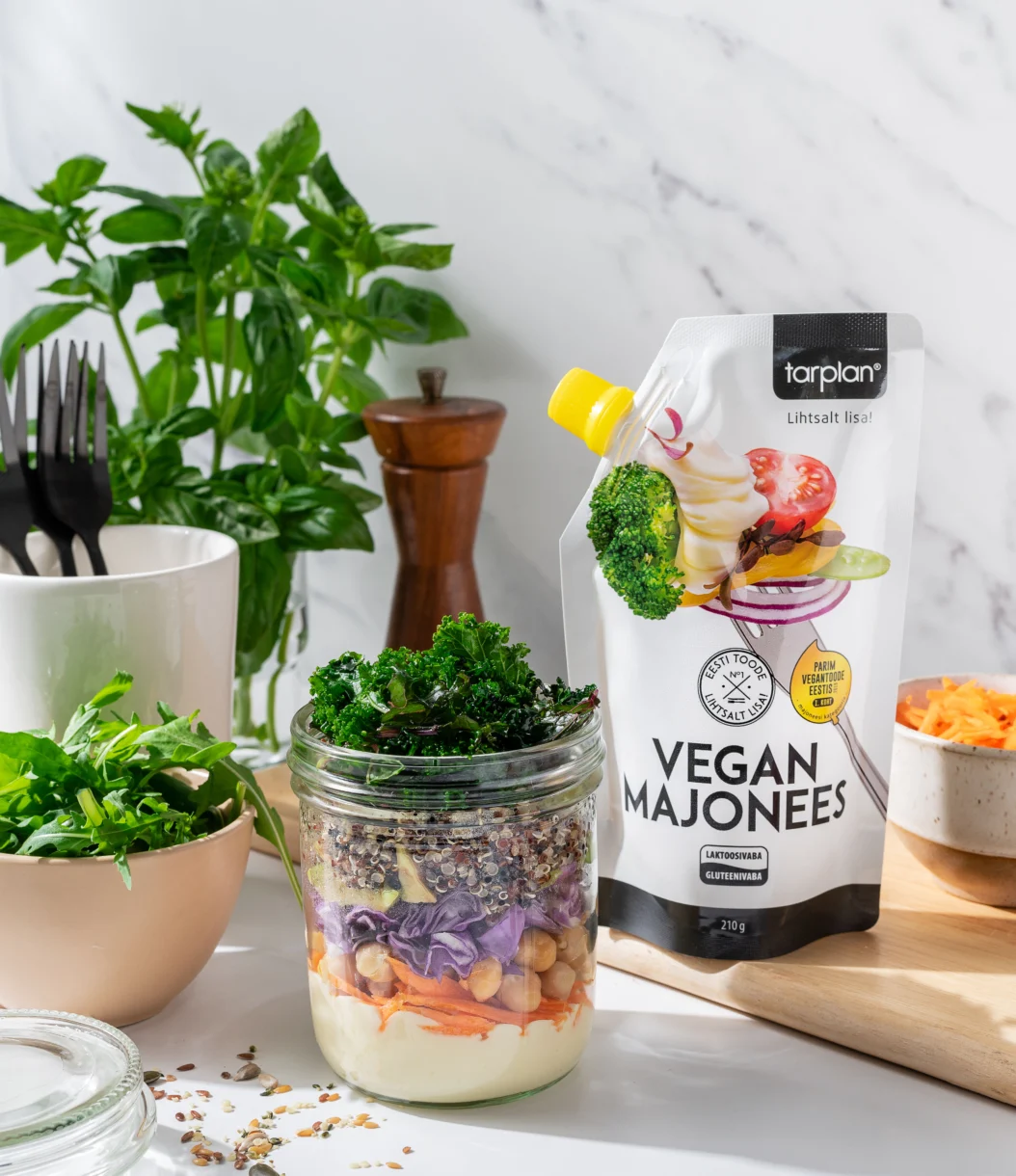 Esimese sammuna valmista kaste. Kastme jaoks võid kasutada ainult majoneesi või hoopis majoneesi segatuna taimse kreeka jogurti või maitsestamata jogurtiga. Kui kaste on valmis, lisa järgmise kihina enda valikul kas pastat, riisi, kikerherneid või kinoad. Kindlasti kuulub ühe salati juurde palju rohelist ja värvilist. Soovitame purki lisada tomatit, porgandit, maisi, kapsast, kurki, ruccolat ja spinatit. Aseta valitud koostisosad kihtidena purkidesse ja kui võluväel ongi maitsev salat valmis!